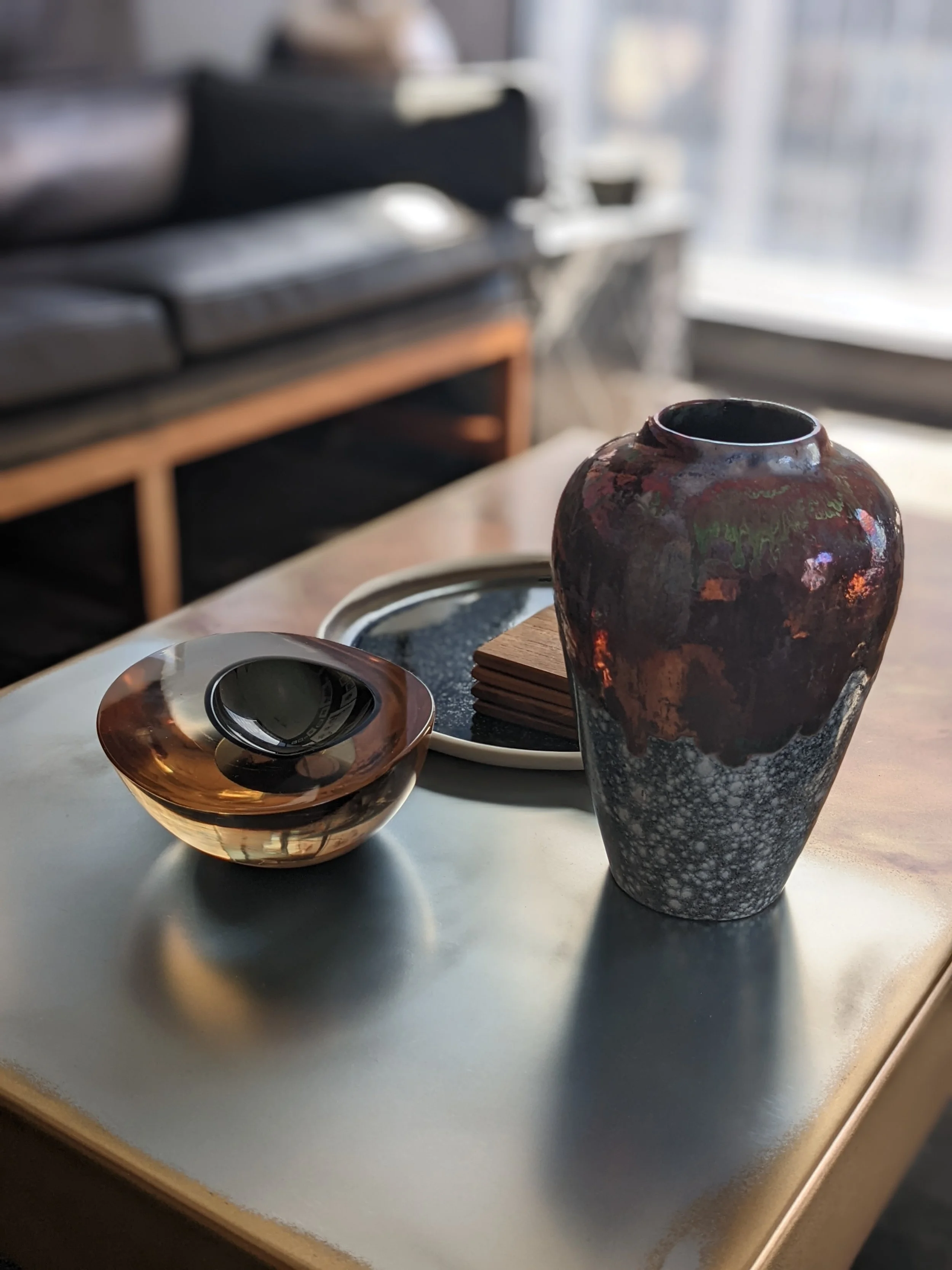 A gorgeous Polish coffee table—a nod to my heritage—became the crown jewel, a piece the client loved instantly. A custom hand-hammered table lamp by a local maker added depth.